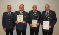Für 40jährige Mitgliedschaft wurde Karl-Heinz Joachim (Vette, 2. v. l.) mit der goldenen Ehrennadel des Volksmusikerbundes NRW ausgezeichnet. Unser Kapellmeister Jürgen Hunke (3. v. l.) bekam die Ehrennadel in Gold des Kreismusikerbundes für 30 Jahre aktive Vereinszugehörigkeit. Unser erster Vorsitzender Stefan Sasse (1. v. l.) gratulierte den beiden Jubilaren und dankte für das erbrachte Engagement im Musikverein.