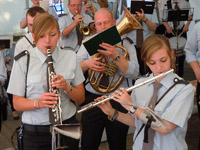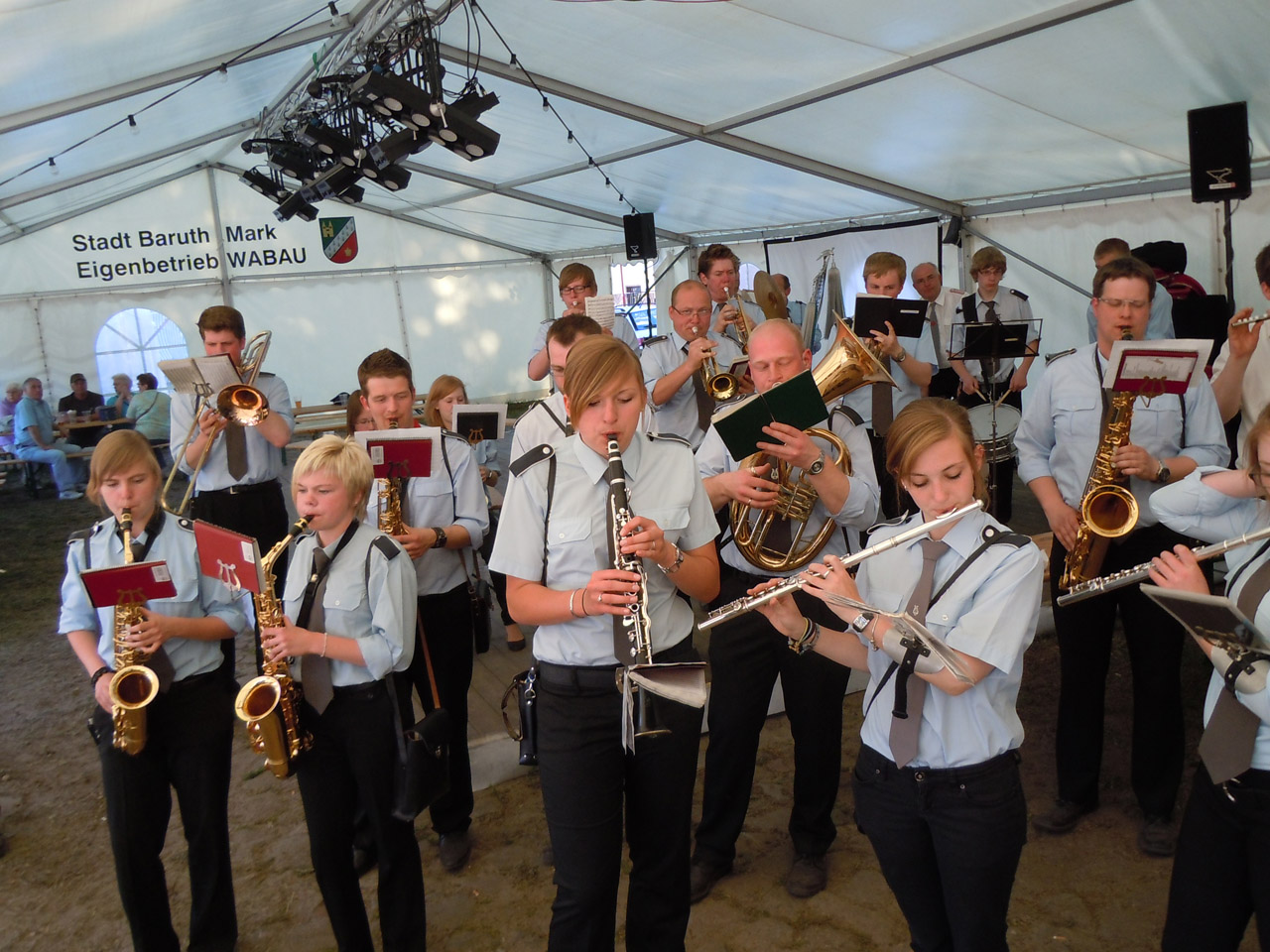 Der Samstag begann mit einem gemeinsamen Frühstück, dass die Feuerwehr Schöneiche für die angereisten Ostenländer vorbereitet hatte. Im Anschluss an den Zapfenstreich am Ehrenmal folgte der Festumzug, an den sich eine große Traktorparade anschloss. In den Pausen des Programms sorgten wir mit Märschen, Polkas und Stimmungsliedern im Festzelt für Unterhaltung. Nicht unerwähnt bleiben soll an dieser Stelle die Planwagenfahrt durch die blühenden Landschaften, an der besonders die mitgereisten Jungmusikerinnen und -musiker Gefallen fanden. Einen Abschluss fand dieser Tag mit dem Auftritt der Liveband „Keinfisch“, die mit ihrer Musik den Gästen einen unvergessenen Abend bereiteten.