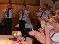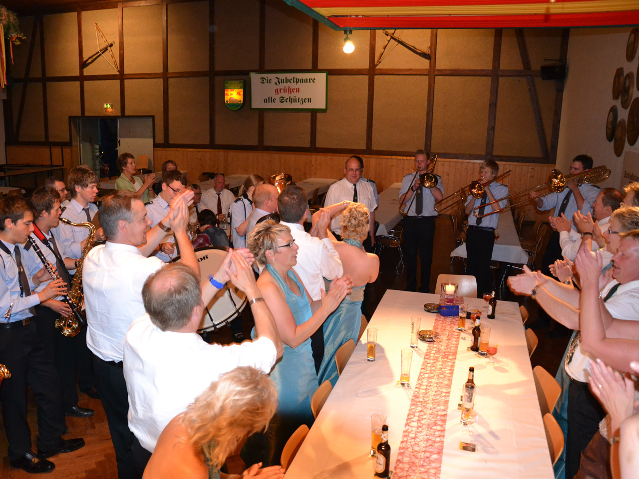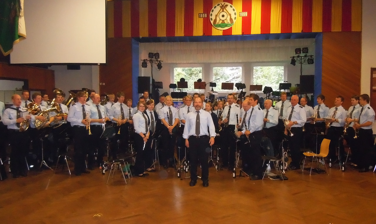 Mit langen Tanzrunden und einem tanzfreudigen Hofstaat feierten die Alfener Schützenfestbesucher mit uns den Festball am Samstagabend. Einen besonderen Programmpunkt stellte das Ständchen am Thron dar, als das Königspaar samt Hofstaat als Indianer mit „Feuerwasser“ um den Thron zogen. Mit dem „Antreten“-Kommando begann für uns der Sonntag in der Schützenhalle am Siekenweg. Nach dem Abholen des Oberst und dem Abschreiten der Front durch den Hofstaat folgte der Marsch zum Mahnmal an der alten Kirche. Getreu dem Motto des diesjährigen Festes „Mit Aufrichtigkeit Zukunft gestalten“ mahnte der Oberst der Alfener Schützen, Josef Drüke, „Traditionen zu pflegen und neue Freundschaften zu knüpfen“. Mit dem Gebet aus dem Großen Zapfenstreich und der Nationalhymne begleiteten wir das Zeremoniell. Nach der Parade marschierten wir zurück zur Halle. Mit einem Platzkonzert unter der Leitung von Ferdi Jüde verlieh das Gesamtorchester dem Nachmittag einen musikalischen Rahmen. Das Konzert fand seinen Abschluss mit einer Gesangseinlage bei dem Marsch „Dem Land Tirol die Treue“, der mittlerweile schon als „heimliche“ Tiroler Landeshymne gilt. Anschließend übernahm unsere BigBand und eröffnete den Festball mit dem Walzer „Wenn der Wein blüht“. Zusammen mit den Gästen aus Kirchborchen, Nordborchen und Wewer nahm der Abend seinen Lauf…
