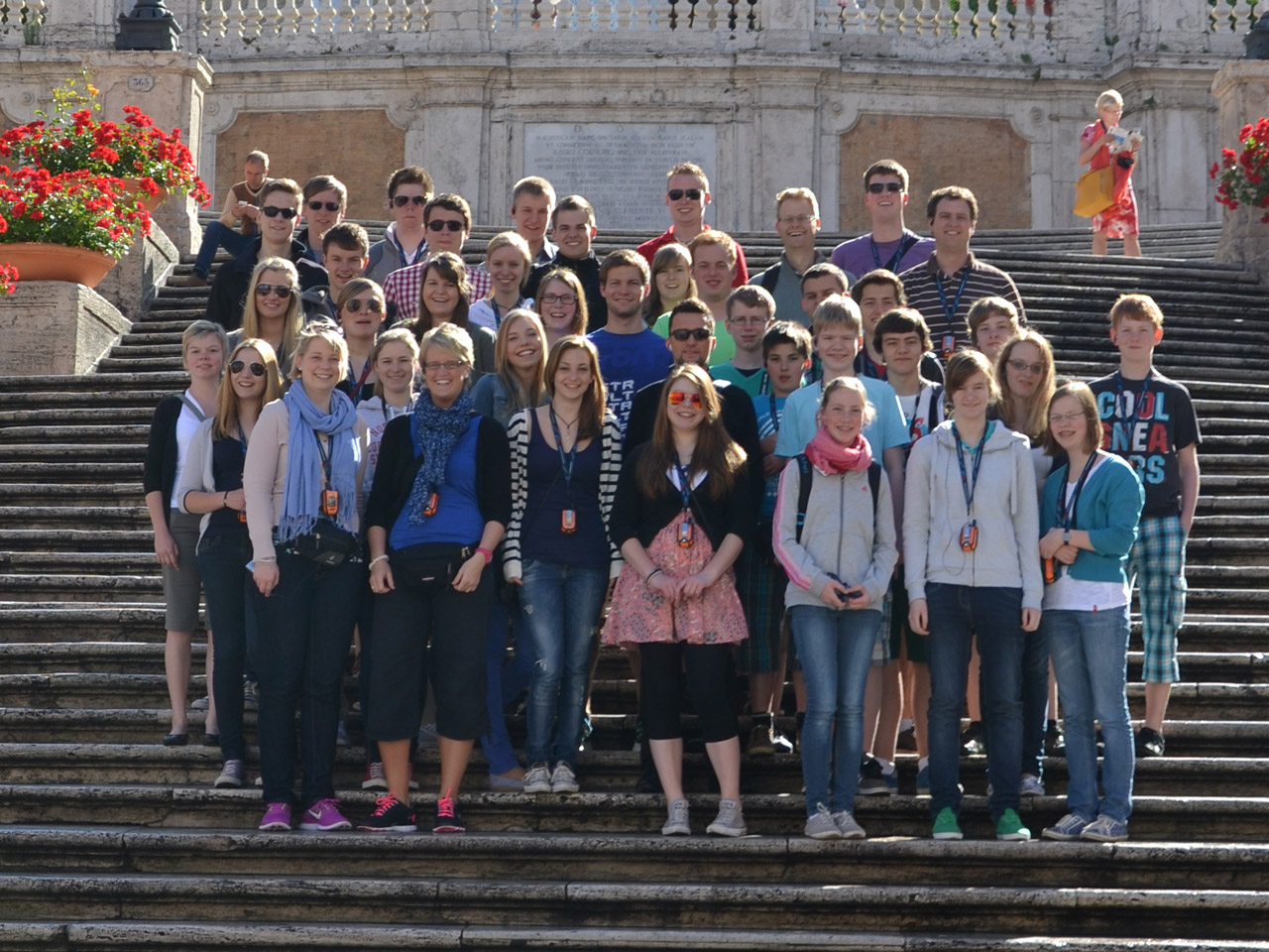 Der Donnerstag begann mit einer Busfahrt entlang des Tibers und vorbei am Piazza del Popolo Richtung Norden zum Treffpunkt mit unserer Reiseleitung an der Villa Borghese, einer „grünen Lunge“ in Rom. Christina, unsere fachkundige Reiseleitung, führte uns zu den bedeutendsten Sehenswürdigkeiten im Centro Storico, der Altstadt im Zentrum Roms. Wir besuchten die Spanische Treppe und den Trevi-Brunnen, bevor wir in der Kirche Santa Maria in Trivio die heilige Messe feierten. Die freie Zeit bot allen Jugendlichen ausreichend Gelegenheit, die zahlreichen Restaurants und Eisdielen auszuprobieren und die Shopping-Möglichkeiten am Corso unter die Lupe zu nehmen. Unsere Gruppe der Mädels gelang es, den Rekord von mehr als 30 besuchten Modegeschäften innerhalb von 3 Stunden aufzustellen. Bevor wir zum Abendessen aufbrachen, besuchten wir das Panthoen und die Piazza Navona, einen der zentralsten Plätze in Rom mit dem weltbekannten Vierströmebrunnen, der von Bernini Mitte des 17. Jahrhunderts erbaut wurde. Ein besonderes Erlebnis war der Sänger und Entertainer, der vor dem Brunnen seine Hits zum Besten gab. Den zweiten Tag unserer Reise beschlossen wir mit dem gemeinsamen Abendessen in der Herberge und einer Orchesterprobe für das bevorstehende Konzert am kommenden Samstag in Rom. Bei italienischem Wein ließen wir den Abend ausklingen und freuen uns auf die noch vor uns liegenden Tage.
