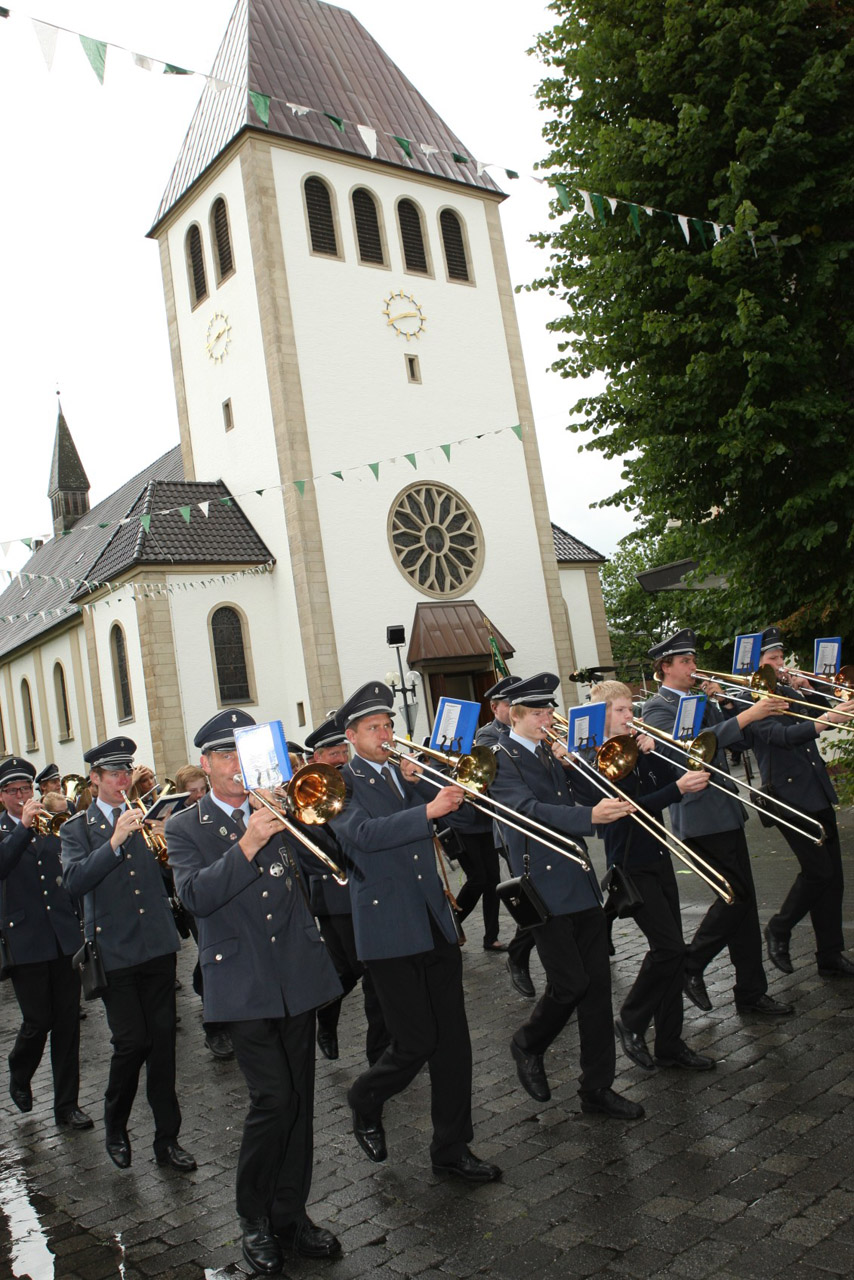 Das diesjährige Ostenländer Vogelschießen wurde am Samstag, dem 7. Juli durch eine Messe der Jungschützen eingeleitet. Pünktlich zu 17 Uhr strömten viele Ostenländer sowie Jungschützen, von der Neugier angetrieben, in die Kirche. Mit „Mull of Kintyre“ eröffnet der Jugendspielmannzug die diesjährige Jungschützenmesse. Die Musikjugend begleitet in dem feierlichen Gottesdienst die Gemeinde mit neuen geistlichen Liedern wie „Jesus Christ, you are my life“, „Halleluja“, „Wenn das Brot das wir teilen“ und „Herr wir bitten komm um segne uns“. Neben instrumentaler Begleitung wurde die Gemeinde durch den Gesang von Anna Jüde und Helena Österdiekhoff unterstützt. Nach der Messe marschierten alle Jungmusiker als blaugekleidete Jungschützen zum Schützenplatz, um gespannt das Vogelschießen zu verfolgen. Später abends haben die Älteren von uns auf der alljährlichen Zeltparty den neuen Jungschützenkönig Martin Middleton gefeiert.