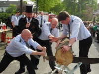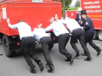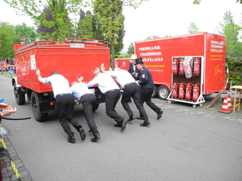 Schon am nächsten Tag stand für die Musikerinnen und Musiker der nächste Auftritt im Kalender: Anlässlich des 85jährigen Jubiläums des Löschzugs Ostenland der Feuerwehr Delbrück fand am und um das Ostenländer Gerätehaus herum ein Tag der offenen Tür statt. Bei der Feuerwehrolympiade ließen es sich sowohl eine Abordnung der Jungmusiker als auch das gesamte Flügelhornregister nicht nehmen, ihre Technik und Kraft beim Unimogschieben, Wettsägen und Fahrradfahren unter Beweis zu stellen. Bei strahlendem Sonnenschein unterhielten wir die Zuschauer mit einem Platzkonzert, bevor der Abend nach dem großen Maipotpourri seinen Lauf nahm.