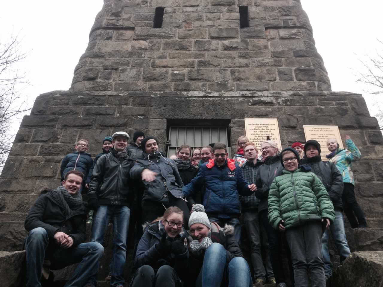 Laut Einladung: „Ein Musiker trägt Kleidung bequem und schön, mit seinen Schuhen kann er auch durch Matsche geh’n“ war klar, dass der Ausflug mit einer Wanderung durch den Wald beginnen würde. Dort gab es viel zu entdecken, wie zum Beispiel geschnitzte Holzfiguren. Nachdem wir eine Zeit lang durchs Laub gegangen waren, haben wir einige Spiele im Wald gespielt, um uns noch besser Kennenzulernen. Bei den Spielen, in denen Teamfähigkeit und Schnelligkeit gefordert war, gab es viel zu Lachen. Weiter ging es zu dem historischen Bismarck-Turm, der zur Fotokulisse für unser Gruppenfoto wurde. Wieder zurück am Auto angekommen, stärkten sich alle mit Brötchen und warmen Tee.