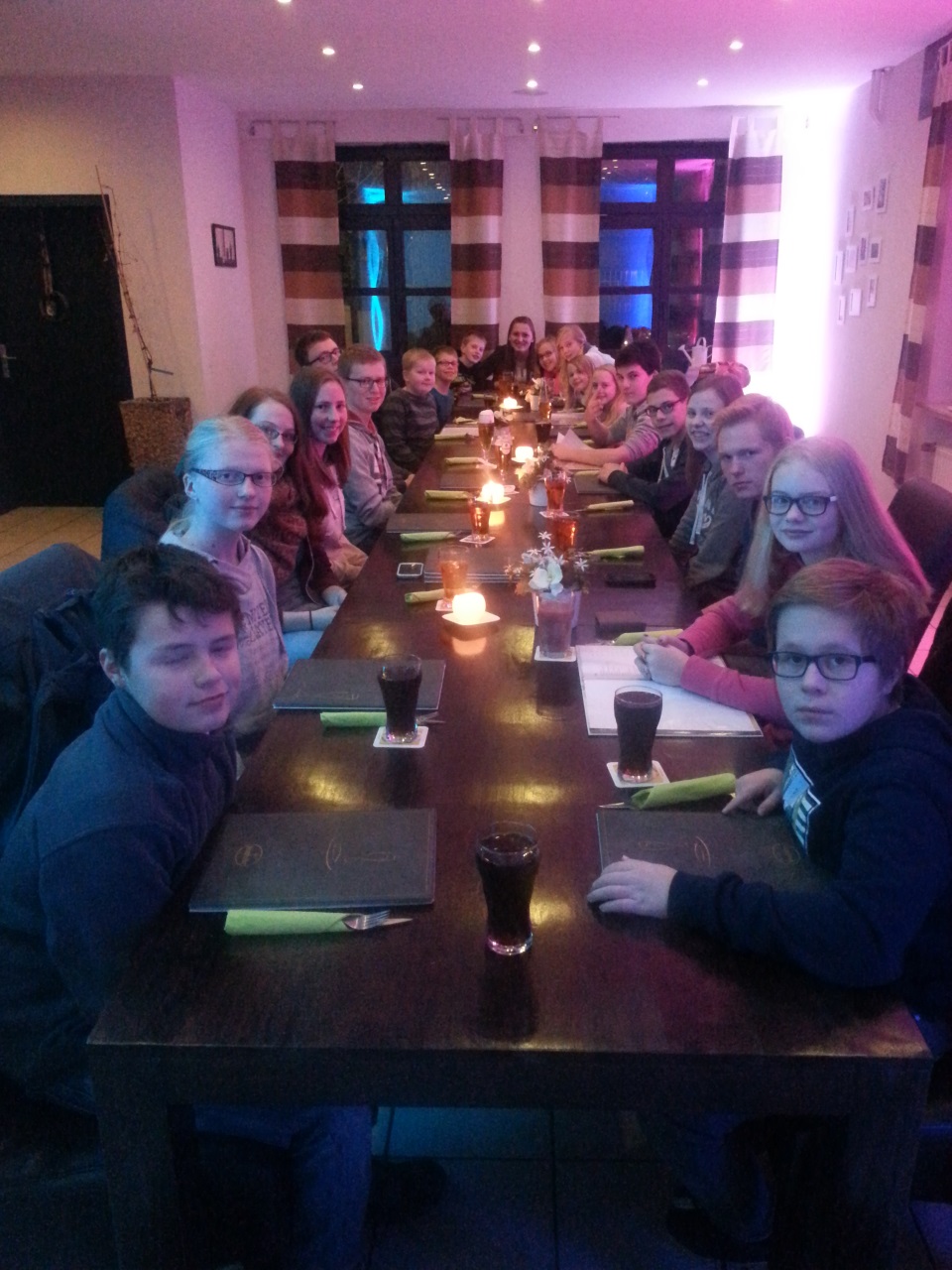 Nach einer weiteren kurzen Fahrt kamen wir am Erlebnisbad H2O an. Nun war das Geheimnis um das Ausflugsziel gelüftet und die Freude war groß. Da im H2O die Eröffnung einer neuen Rutsche gefeiert wurde, begrüßte man uns mit Süßigkeiten. Nach der Wanderung bei kaltem Wetter ließ es sich gut einige Stunden im warmen Wasser aufhalten. Zur Entspannung stand der Eierkocher bereit und für Spiel und Spaß sorgten Rutschen, Wellenbecken und Strudel. Erschöpft, aber zufrieden ging es um 17 Uhr wieder zurück Richtung Ostenland. Danach gesellten sich die Musiker, die nach dem Schwimmen Lust auf italienisches Essen hatten, in die Pizzeria Rustica. Hier haben wir den Tag in gemütlicher Runde ausklingen lassen. Ein großes Dankeschön geht von dieser Stelle an das Orga-Team um Helena und Lisa!