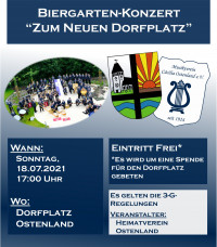 Wir bitten jedoch um eine Spende, damit wir einen Teil zur Finanzierung des Dorfplatzes beitragen zu können. In lockerer Biergarten-Atmosphäre verwöhnen die Musikjugend sowie das große Orchester die Zuhörer mit musikalischen Leckerbissen. Kühle Getränke werden ebenfalls angeboten. Veranstalter ist der Heimatverein Ostenland.