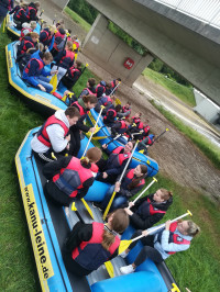 Am Samstag stand eine abenteuerliche Aktion an. Wir versammelten uns zu einer Schlauchboottour. Nach einer kurzen Einweisung paddelten vier Schlauchboote auf der Leine los, um nach 12 Kilometern das Ziel zu erreichen. Nach drei Stunden und einigen Stromschnellen erreichten die Boote das Ziel, wo wir mit Kuchen empfangen wurden. Es war für alle eine schönes und abenteuerliches Erlebnis.