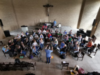 Wir teilten uns zunächst in zwei Gruppen auf. Die Gruppe mit den neuen Musikerinnen und Musikern begann mit Dominik Berenspöhler, Lani Bentler und Marie van Almsick Stücke, wie das Rockstück „We Will Rock You“, kennenzulernen. Auch die restliche Jugend begann mit den Proben.